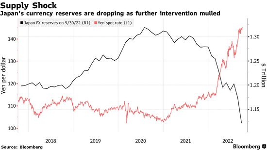 “如果美国就业数据巩固了对美联储加息75个基点的猜测,日元可能测试145区间。无论日本花费多少外储,干预并不能完全阻止日元疲软,只能导致日元暂时震荡反弹。” 日本财务省的数据显示,截至9月底,日本的外汇储备从一个月前的1.29万亿美元降至1.24万亿美元,持有的外国证券减少了550亿美元。“日本9月份的外储降幅是有记录以来最大的”,财务大臣铃木俊一说,“下降的原因包括证券价值随着收益率上升而下跌,以及日本抛售外汇以进行干预”。日本财务省上周表示,它在9月份花费了2.84万亿日元(196亿美元)来限制日元的下跌。 |